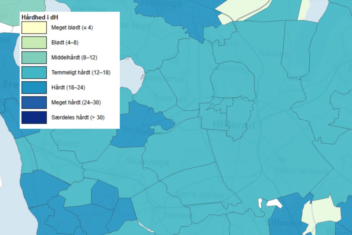 Zoom ind på kortet for at få et klart billede af vandhårdheden i Hillerød — er du i et område med hårdt vand, eller har du lettere ved at håndtere kalken i dit område?