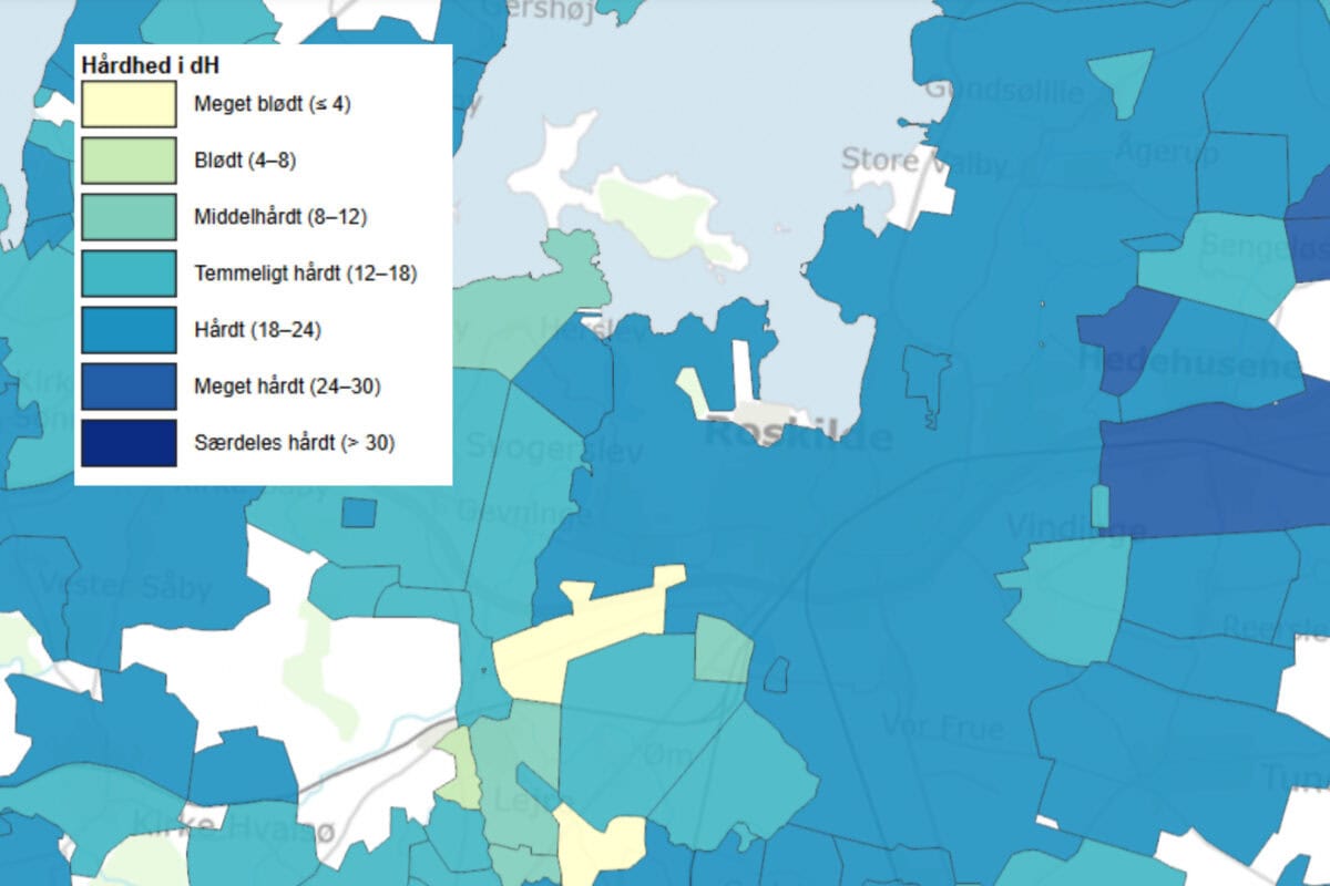 Vil du kende den præcise vandhårdhed på din adresse? Besøg GEUS’ interaktive kort for detaljerede oplysninger om vandkvaliteten i Roskilde.