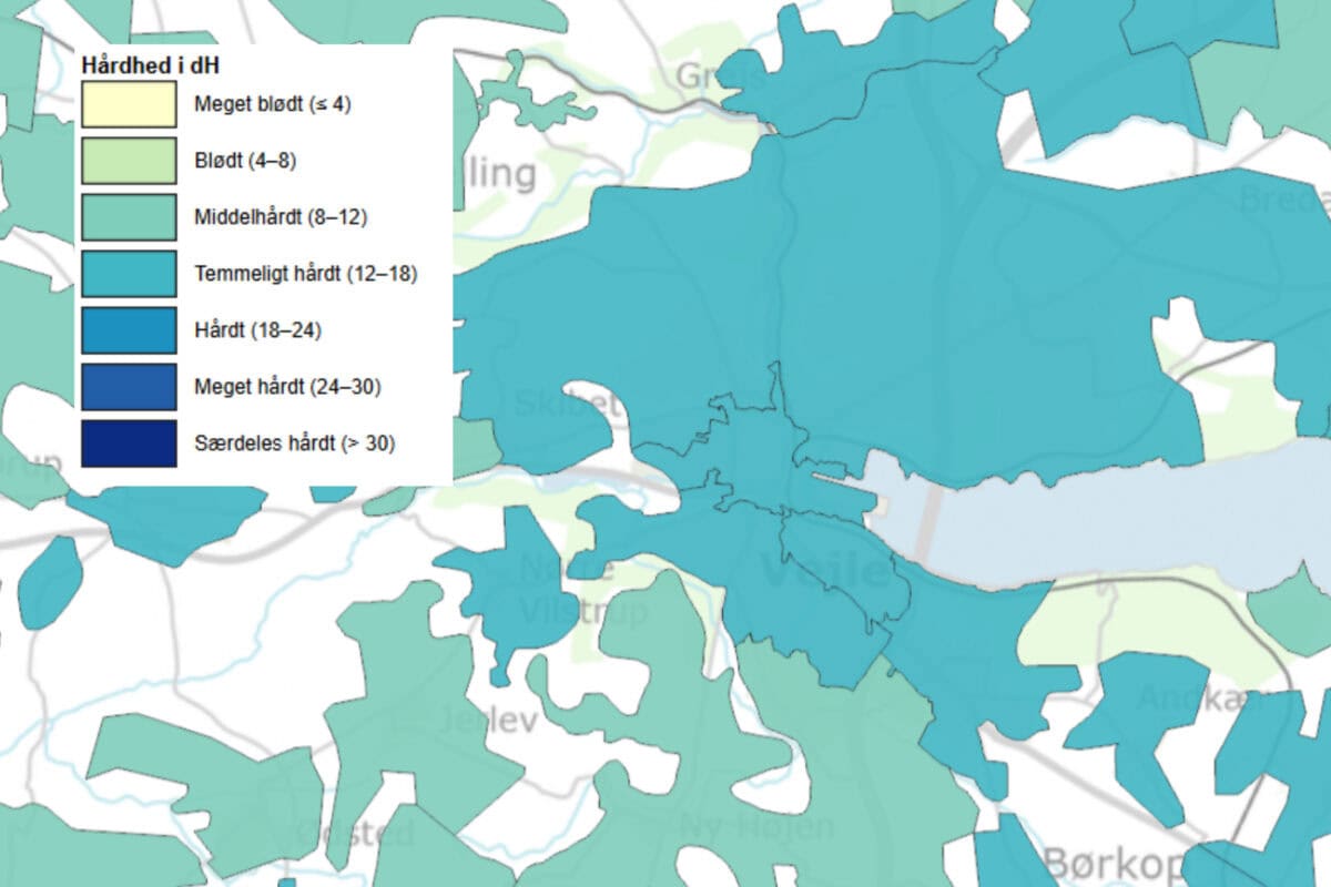 Zoom ind på kortet for at få et overblik over vandhårdheden i Vejle — er du i et område med hårdt vand, eller har du lettere ved at håndtere kalken i dit område?
